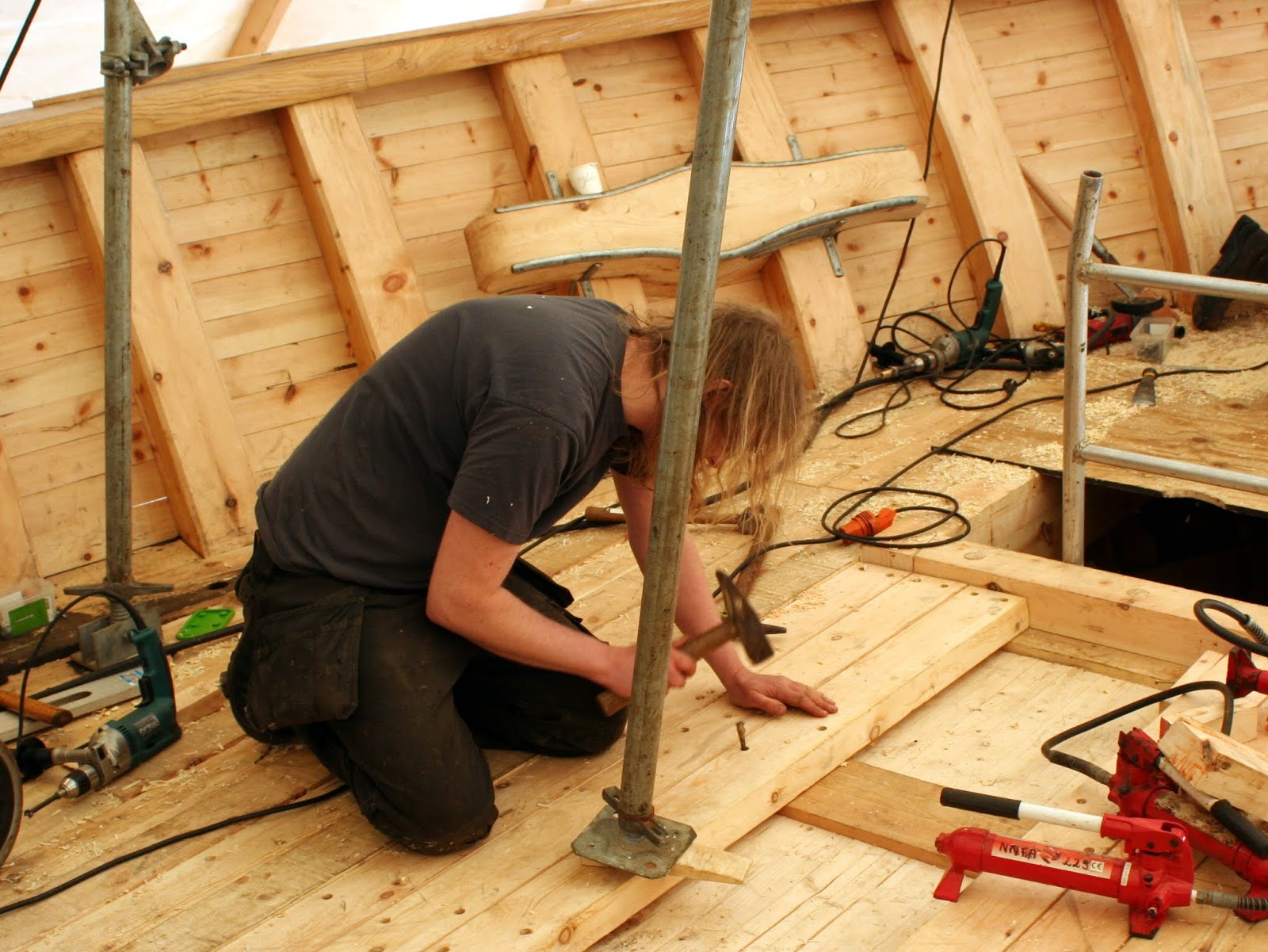 I hovedsak er det "The English Branch" av fartøyvernsenteret, Anthony, Dan og Jay, som står for dekkssarbeidet. Her ved Jay som er i ferd med å lukke siste del mellom luke og lugarnedgang.